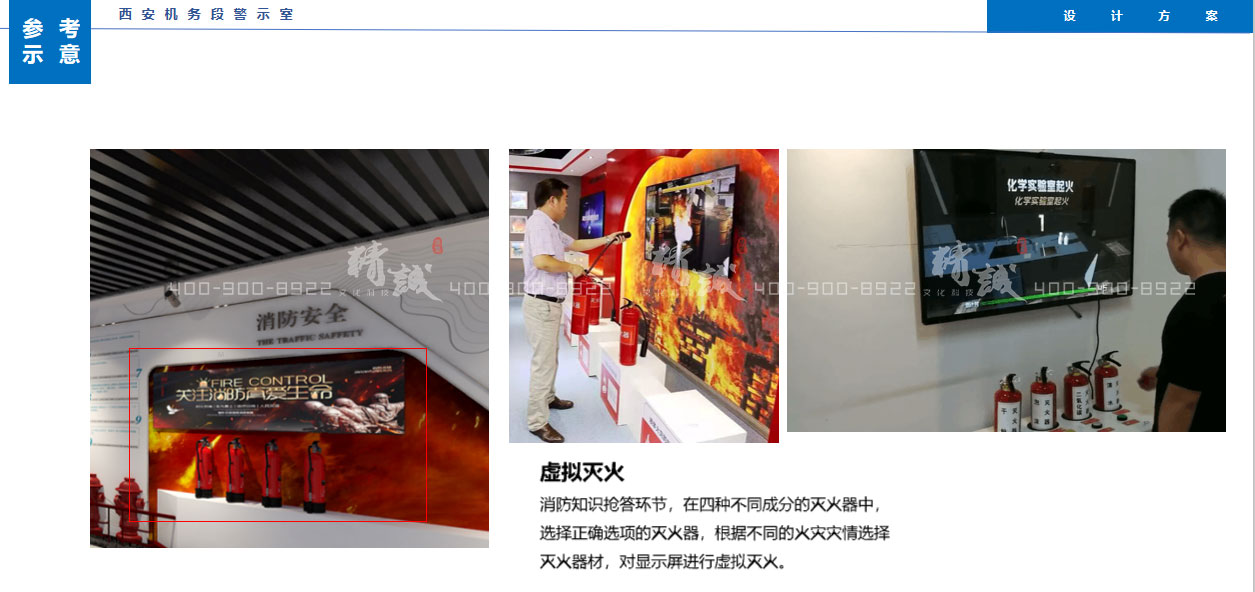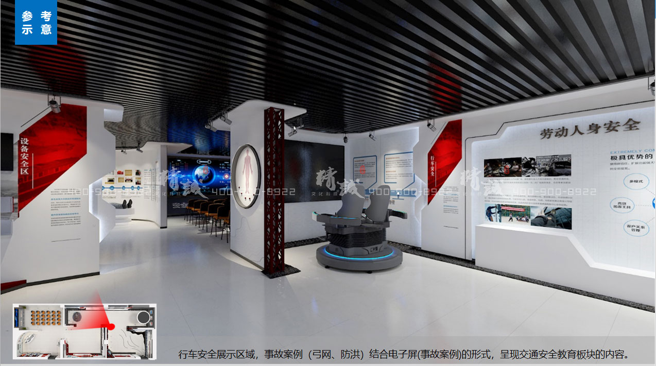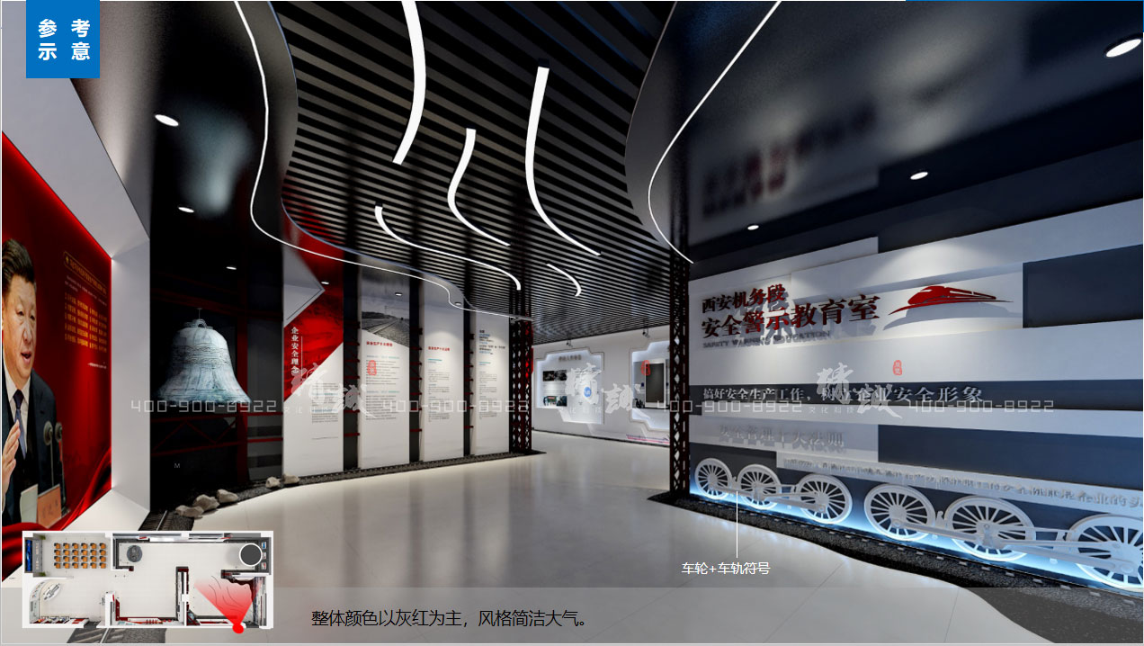 1. 安機務段安全警示教育室展廳整體顏色以灰紅為主,風格簡潔大氣,頂部采用黑色鋁方通,及動態(tài)造型燈帶,增加展廳設計感,習總書記關于安全生產(chǎn)的講話,在進入展廳伊始,拔高政治站位,提升思想高度,并通過敲響警鐘,增加儀式感。交通安全展示區(qū)域,事故案例展示,結合交通安全知識答題。
