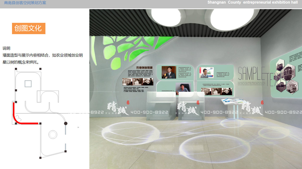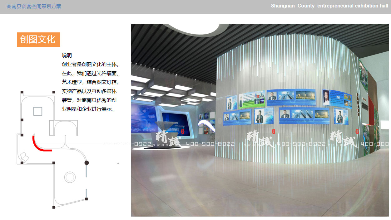 創(chuàng)業(yè)者是創(chuàng)圖文化的主體,在此,我們通過光纖墻面、藝術(shù)造型,結(jié)合圖文燈箱、實物產(chǎn)品以及互動多媒體裝置,對商南縣優(yōu)秀的創(chuàng)業(yè)明星和企業(yè)進行展示。