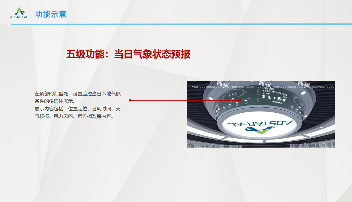 五級功能:當(dāng)日氣象狀態(tài)預(yù)報(bào),在頂部的造型處,設(shè)置監(jiān)控當(dāng)日本地氣候條件的多媒體展示。