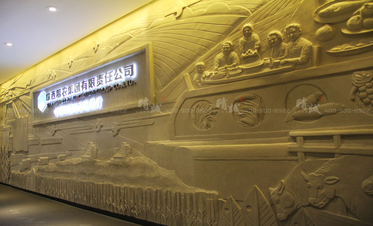 步入展廳入口,整面砂巖墻通過幾組不同場景的浮雕組合,展示了糧農(nóng)產(chǎn)品從田間到餐桌的全生產(chǎn)鏈,給人沉穩(wěn)的視覺體驗,在朝陽的映襯下,畫面寓意糧農(nóng)集團代表著中國糧食行業(yè)即將迎來輝煌而嶄新的未來。浮雕畫的形式,彰顯集團的農(nóng)業(yè)基石地位,大氣恢宏中彰顯集團不凡實力。