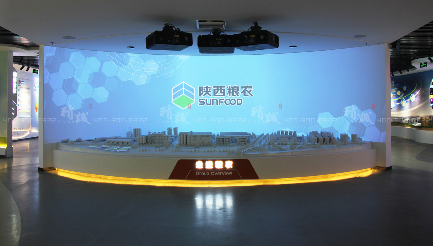 利用數(shù)字投影升級沙盤,配合弧幕投影,以聲光電聯(lián)動的效果播放糧農(nóng)集團宣傳片,給觀者以強烈的視覺震撼。
