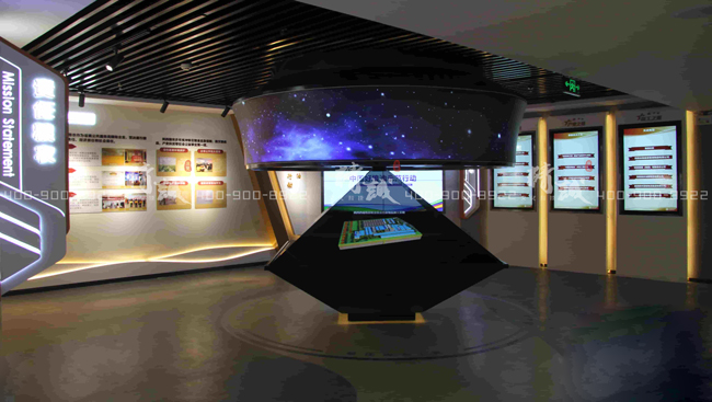 采用360全息成像技術(shù),頂部藍天裝飾,以多媒體表現(xiàn)手法,呈現(xiàn)集團所屬公司及重點項目發(fā)展。