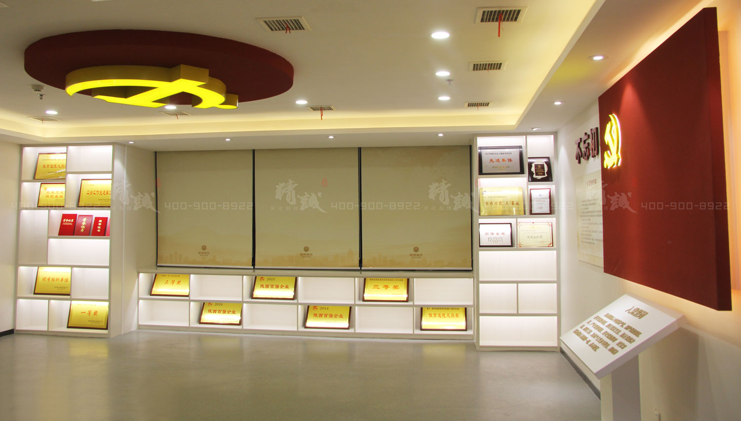 該板塊采用墻面圖文展板+多媒體顯示屏,并結(jié)合細節(jié)化背發(fā)光式場景墻面裝飾,以頂墻地三面結(jié)合的畫面形式,對集團的發(fā)展、榮譽進行展示,達到視覺的豐富感和連貫性。