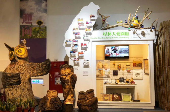 貓頭鷹幸福社區(qū):貓頭鷹的木雕造型與現(xiàn)代櫥窗相結合,櫥窗是木板烤漆制作美食鄉(xiāng)宴:竹屋的藝術造景櫥窗里面陳列了各種鄉(xiāng)下美食,通過玻璃隔斷上的二維碼,掃一掃可以進行線上購買,在這個展館當中,沒有設置線下的文創(chuàng)商店,都是通過這種櫥窗展示,線上下單購買文旅商品,節(jié)省出更多的空間給展示功能區(qū)